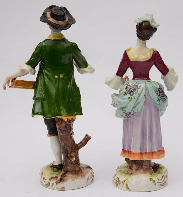 in 18th century dress, the gentleman holding a tray of flowers, the lady a flower basket, gilt scroll bases, underglaze blue factory marks, (2)