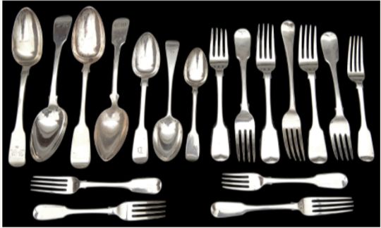 Condition: Tines of two table forks have been shortened as have tines of one dessert fork. Otherwise condition commensurate with age and use