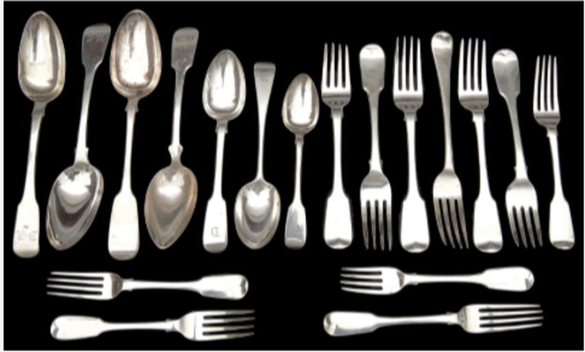 comprising three fiddle pattern tablespoons, a German .800 fiddle pattern tablespoon, five George IV table spoons and two dessert forks, London, 1821 by