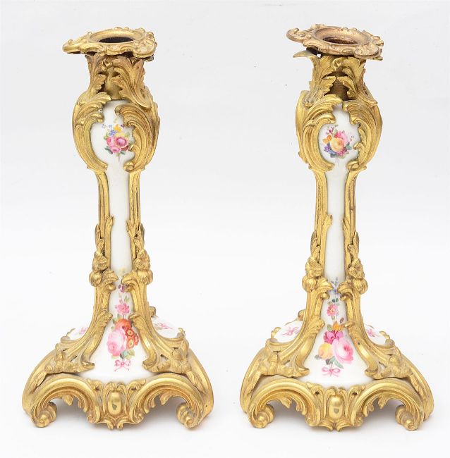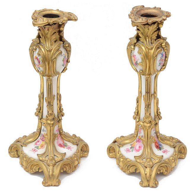A pair of late 19th century French ormolu mounted porcelain candlesticks
