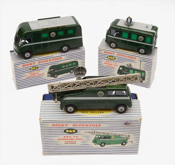 967 - B.B.C. T.V. Mobiles Control Room, 968 B.B.C. T.V Roving Eye Vehicle, with plastic antenna, 969 - B.B.C. T.V. Extending Mast Vehicle, all three in the original blue and white striped card Supertoys boxes, (3)