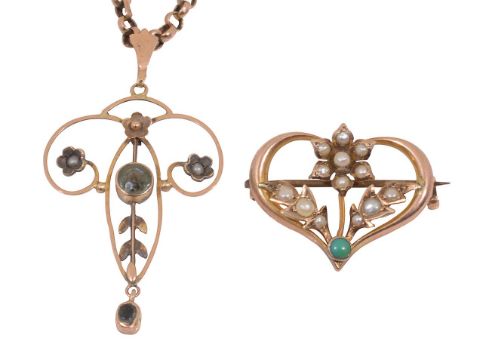 with flower spray inset with seed pearls and single turquoise stone, together with a 9ct Edwardian pendant with pale aqua (?) on late chain