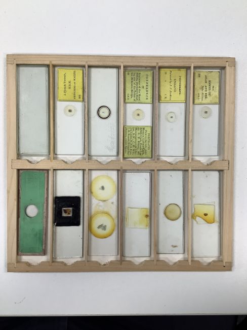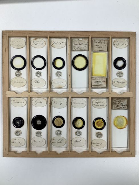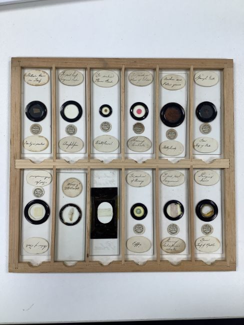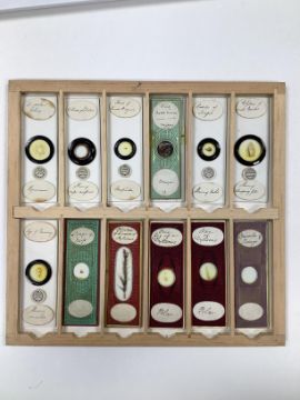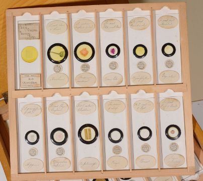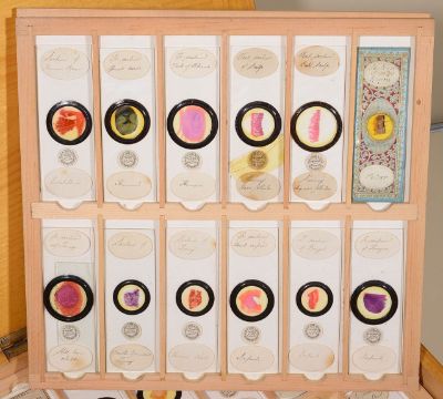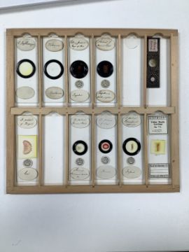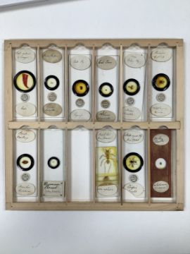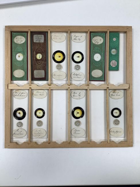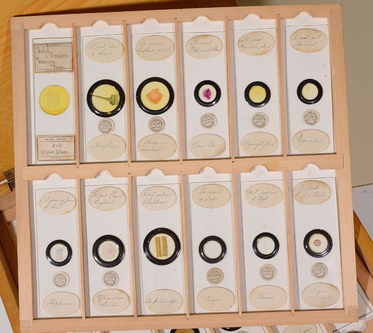 the slides contained within individual drawers prepared predominantly by H.W.H.Darlaston and with paper labels, other labels include Flatters & Garnett, J. J. Bourgogne, specimens include gall fly, female bed bug, section of human brain etc..., contained within a pine case with securing catches to the front