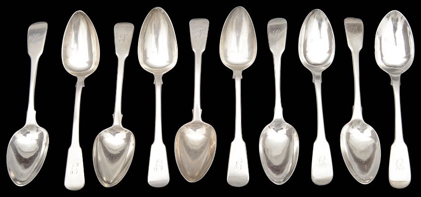 A set matched of ten, George III / IV silver fiddle pattern desert spoons