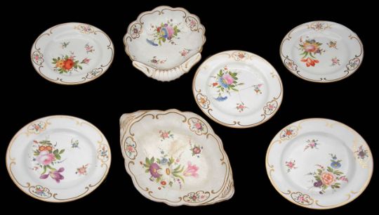 painted with flower sprays and scattered sprigs within gilt scroll border with the sprig painted reserves, gilt rims, comprising a shell shaped dish, a lozenge shaped dish and five plates, (7)