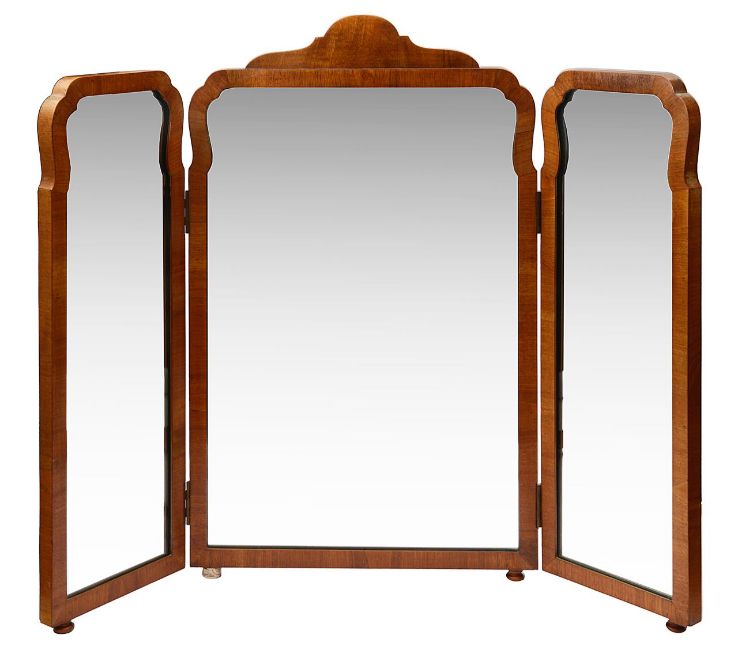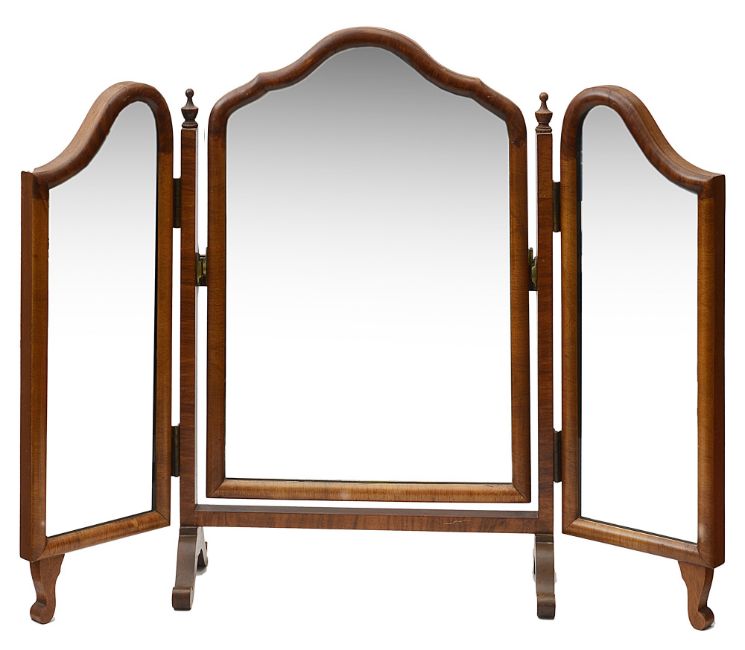 Two early 20th century Queen Anne style walnut triptych dressing table mirrors, (2)
