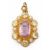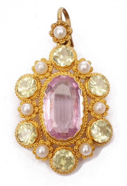 having central oval pink topaz within a yellow/green chrysoberyl and pearl set cannetille work pendant mount, tests for gold