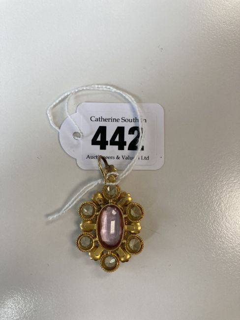 A Georgian pink topaz and green chrysoberyl cannetille pendant
