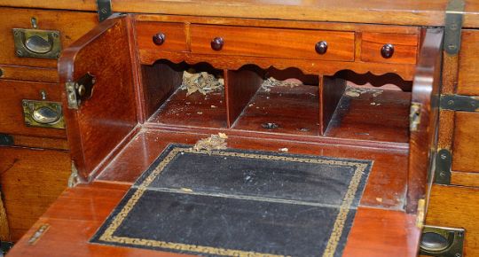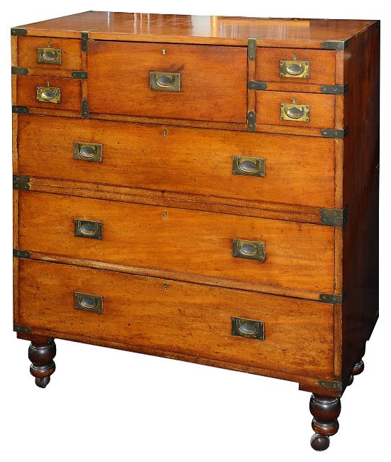 Condition: Possibly of colonial manufacture, old surface marks and scratches commensurate with age and use, brass bindings and handles with wear and tarnish, writing leather cracked on fold of hinge, shepherd casters later, otherwise in very good condition,