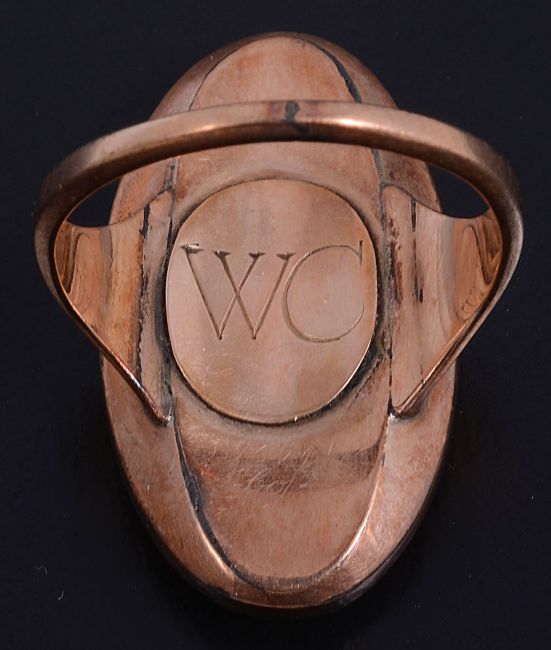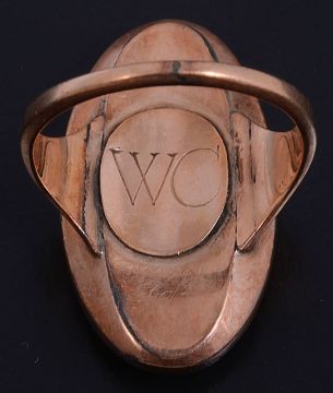 the plain rose coloured metal oval locket ring enclosing plaited hair, engraved W.C. to reverse, mount tests for gold
