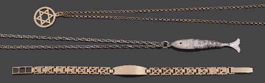 together with a 9ct gold Star of David pendant on chain, chain a.f. and a silver articulated fish pendant on chain (3)