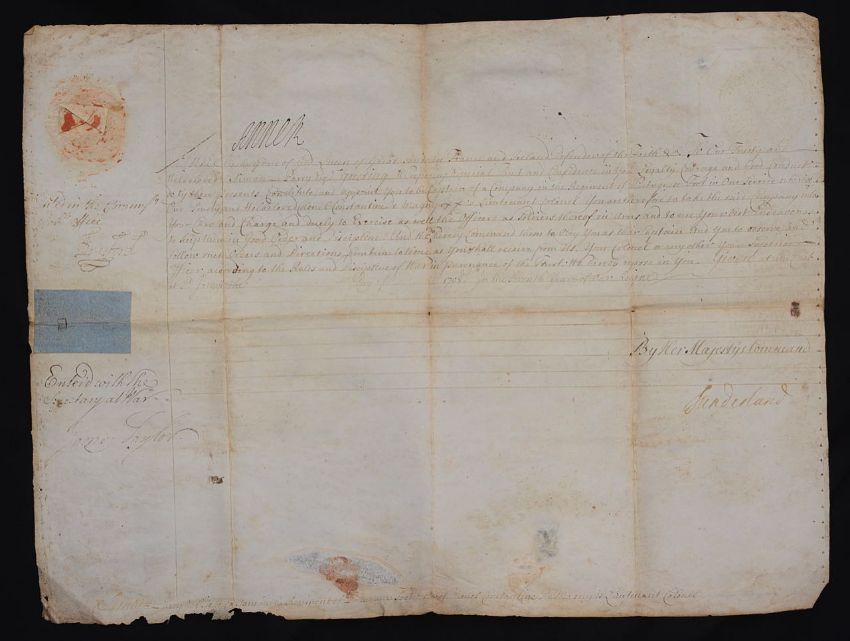 dated 1708 and appointing Simon Parry to be captain in a regiment of Portugese Foot, countersigned by Charles Spencer, 3rd Earl of Sunderland and James Taylor, Secretary at War,
