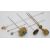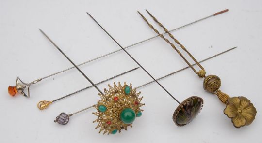 the hat pins include a Scottish silver pin with thistle, a Charles Horner pierced gold mounted steel pin, a Continental pierced gilt metal pin mounted with semi-precious stones, an Italian aventurine glass pin, a two prong gilt metal pin and one other, together with a Noritake tapered hat pin stand with gilt floral decoration against a green ground together with matching dressing table pot (8)