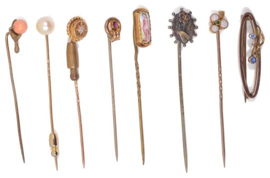 A Victorian opal set trefoil stick pin and a collection of other stick pins