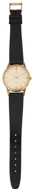 with champagne coloured dial, gilt baton numerals, on black leather strap, stamped 375 on the inside of case