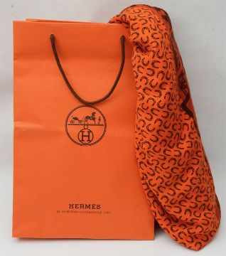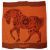 designed by Bali Barrett, brown and red against a burnt orange ground with brown horseshoe design and central horse figure, without box but in original bag and tissue