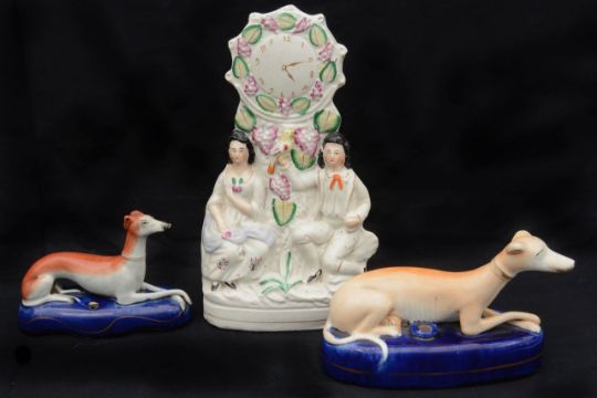 Two 19th century Staffordshire recumbent greyhound pen stands and flatback clock group, (3)