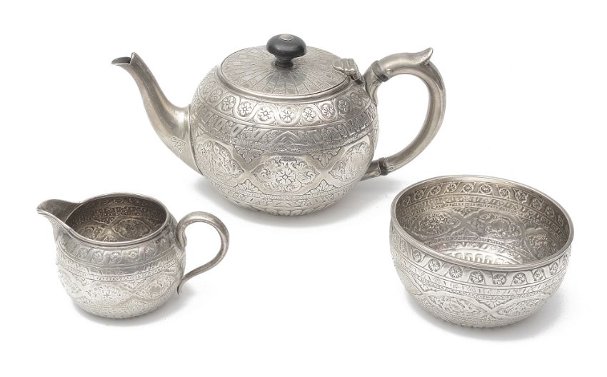 comprising teapot, sugar basin and milk jug, of compressed form, all over chased with Indian style decoration, monogrammed, (3)