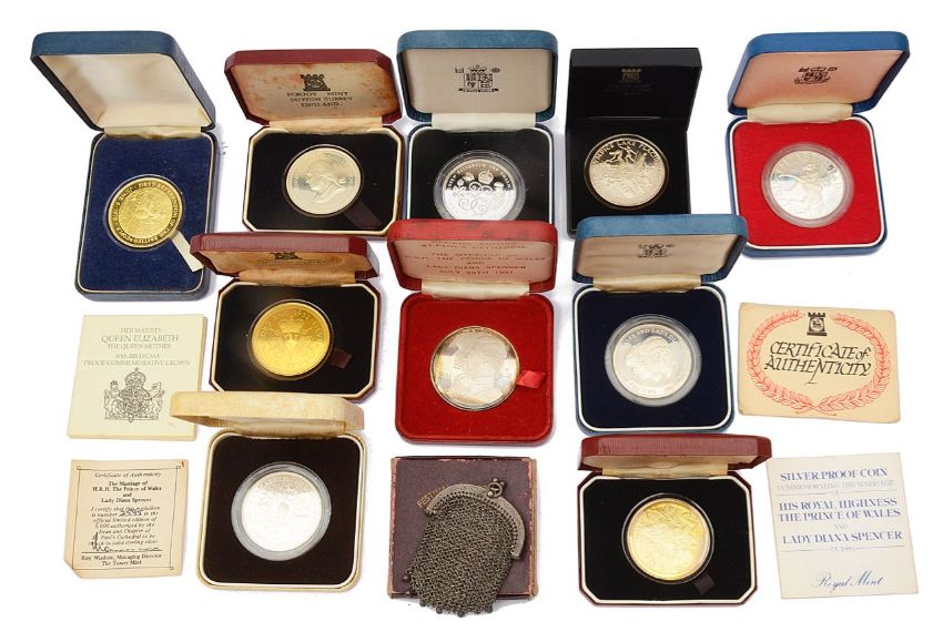 comprising Canada Elizabeth II 2006 .999 1/20oz gold 1 dollar, commemorative silver crowns: 1951 Festival of Britain, 1977 silver jubilee, 1980 Queen Mother 80th Birthday, 1990 Queen Mother 90th Birthday crown, Isle of Man: 2 x 1976 Bicentenary of American Independence Crowns, 1977 Silver Jubilee 1980 Winter Olympics Lake Placid U.S.A. Crown together with 1975 First Referendum of the British People into a United Europe gold pated silver proof, 1976 Pobjoy Mint 22 carat gold plated Field Marshall Viscount Montgomery of Alamein crown medal, Royal Mint 1981 Prince of Wales and Lady Diana Spencer silver proof coin, The Tower Mint limited 1981 Prince of Wales and Lady Diana Spencer silver medallion, a French silver chain mesh coin purse