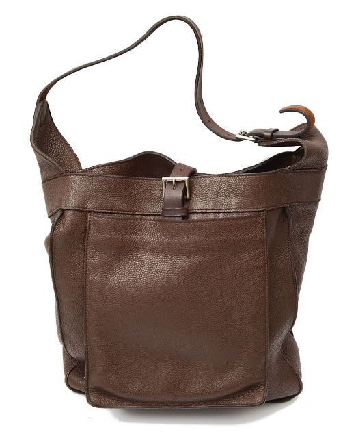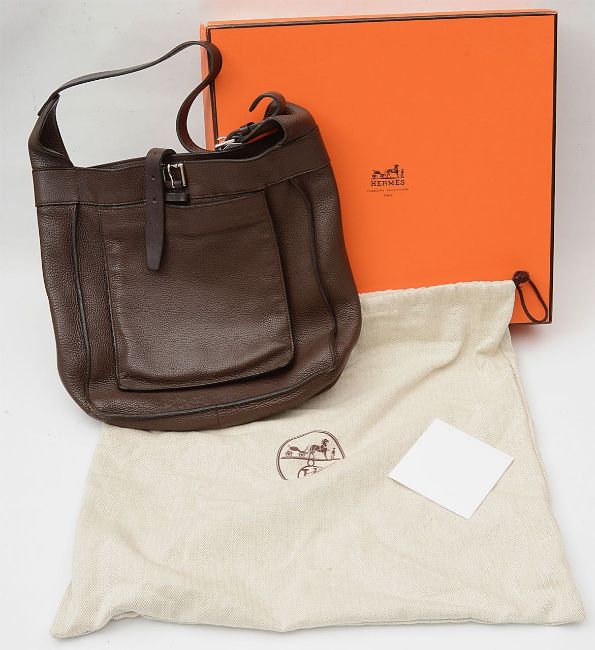 with pouch to the front, and zipped interior pouch, canvas lined interior and buckle fastener, with Hermes canvas dust bag and original box