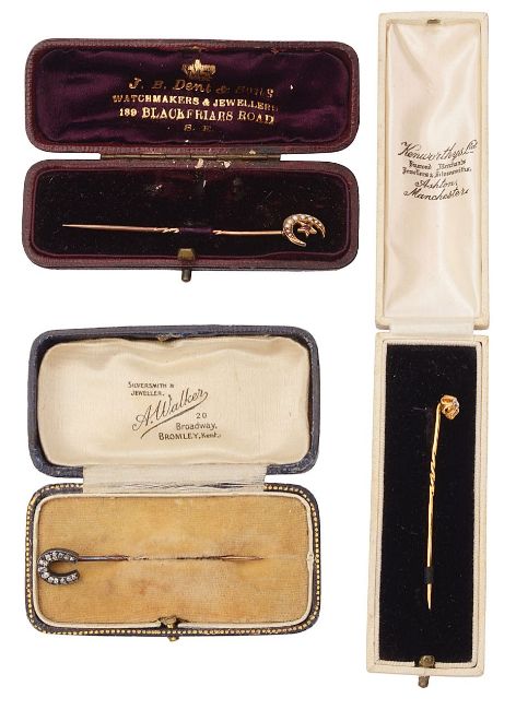 comprising a horse shoe shaped pin inset with rose cut diamonds in fitted case, another with an 18ct crescent and star shape mount set with seed pearls and amethyst in a fitted case , together with another later pin with yellow metal mount testing for gold inset with diamond in fitted case (3)