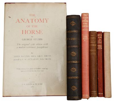 The Anatomy of the Horse by George Stubbs, London, J. A. Allen & Co. Ltd, 1965, the 1766 edition and illustrations, with a modern veterinary paraphrase by James McCunn, folio, d.w., Roberts, Captain Edric G., Hunters' Moon and other Hunting Verse, eight tipped tipped in colour plates by Gilbert Holliday, Macdermot. E. T., The Devon and Somerset Staghounds 1907-1936, illustrated by Lionel Edwards, 1936, a/f d.w., Collyns, Charles Palk, Notes on The chase of the Wild Red Deer, 1902, dec. green cloth, Ogilvie, Will H., Scattered Scarlet illus. by Lionel Edwards, 1923, and W.J. Miles Modern Practical Farriery c.1880, (6)