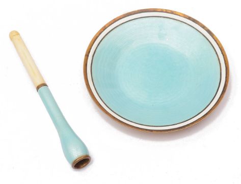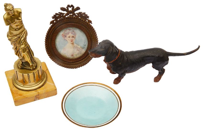 first marked A SILVER-PLAT decorated with pale blue guilloche to centre within a white banded border together near matching pale blue guilloche enamel cigarette holder with bone mouthpiece, a brass figure of the Venus de Milo on a sienna marble base, a cold painted spelter Dachshund and a continental portrait miniature of a young woman c. 1900, watercolour on ivory, ormolu frame with ribbon tied cross torch and quiver crest, (5)