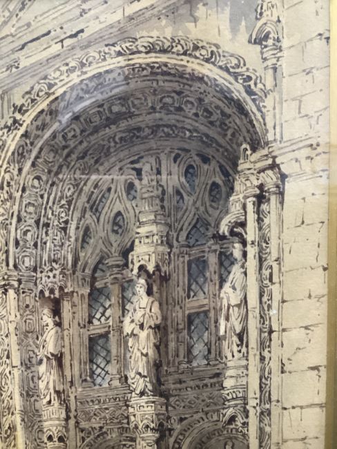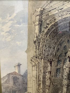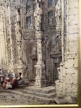 'Cathedral door with figures', watercolour, monogrammed lower right, mounted and in ornate period frame
