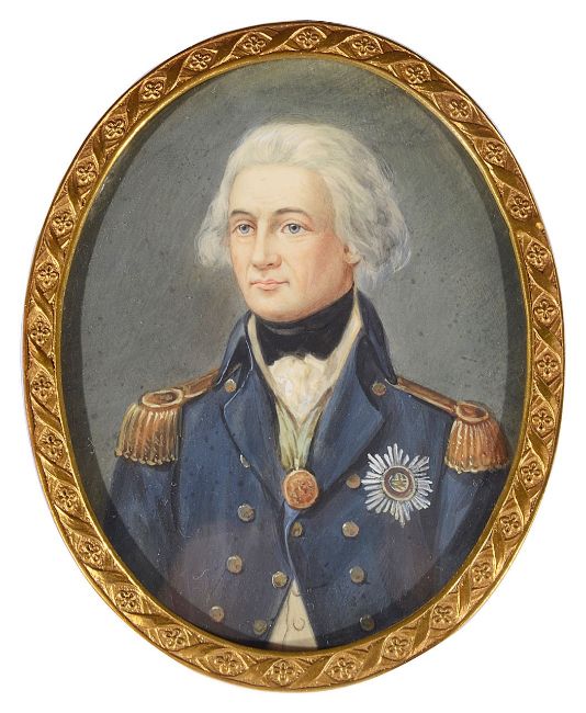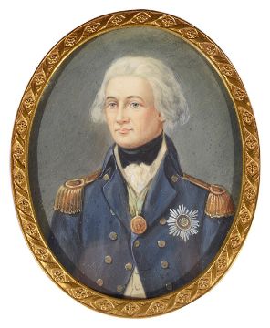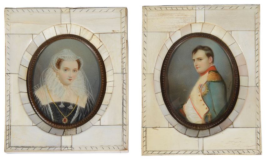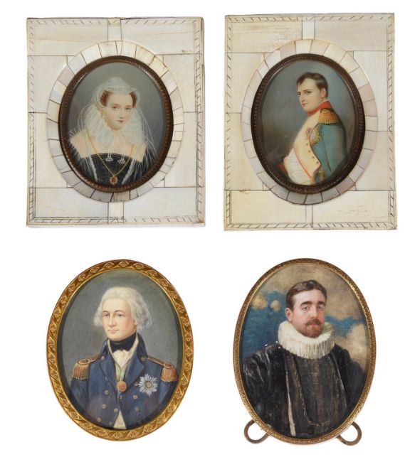comprising a portrait of Mary Queen of Scots, oval watercolour on ivory signed Dupre and a portrait of Napoleon signed Beauy? both in ivory piano key frames together with a portrait of Nelson, and another portrait of a gentleman in 17th century attire, brass oval frame with easel support (4)