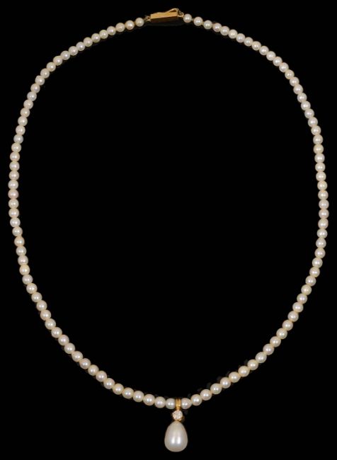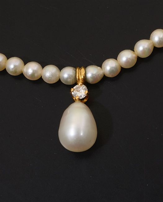 the even size pearl necklace with single stone diamond and tear shaped pearl drop, yellow metal mount and clasp test for gold