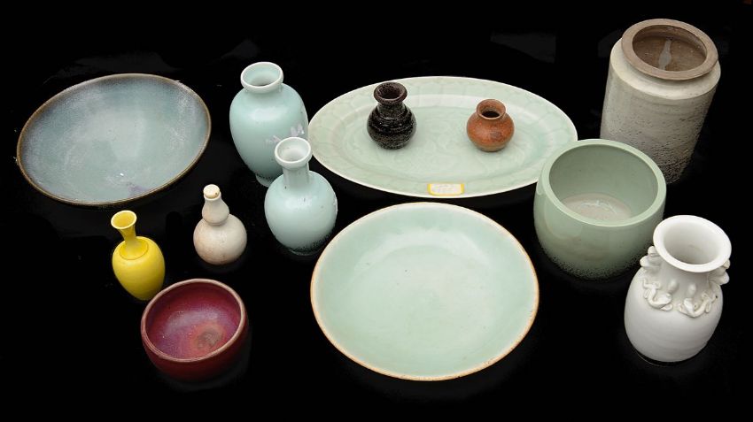 to include a yellow glazed porcelain miniature vase ,a pale sang de boeuf double gourd snuff bottle, an oval celadon plate decorated with goldfish, a sang de boeuf glazed small pottery bowl, a celadon glazed shallow dish, undeglaze blue character mark, etc., (qty)