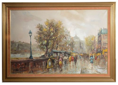 'Parisian street scene with view of the Seine', oil on canvas, signed lower right, framed, 'AFA London' stamp to canvas reverse,