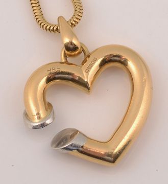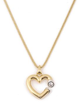 An 18ct yellow gold and diamond pendant and necklace, the openwork heart pendant set to one side with a brilliant-cut diamond, London hallmark to the French fox tail link necklace, French control mark for gold