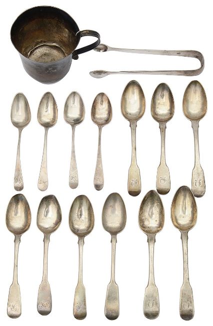 comprising an early George III twin handled cup a/f, London, 1762 maker mark I*M either Jacob Marsh or John Moore, of plain design with a reeded loop handle, initialled D over J*M, together with a pair of plain sugar tongs, five matched fiddle pattern teaspoons, initialled, and various other assorted teaspoons, (qty)
