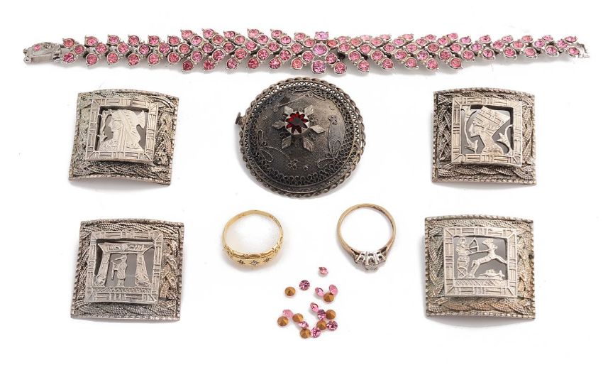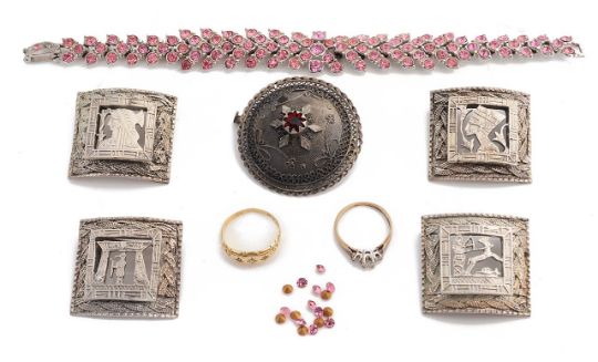 An Edwardian diamond gypsy ring and another ring and silver broochesthe former set with three small diamonds in 18ct scroll mount, marked for Chester 1910, the latter a small three stone brilliant cut diamond set ring, yellow metal mount stamped 9ct together with four Egyptian silver square brooches, probably converted from a bracelet, each stamped silver to reverse, a circular white metal filigree 'target; brooch, tests silver and a costume jewellery pink rhinestone set bracelet a.f. (7)size respectively K/L & M, brooches approx. 4 x 3 cmCondition: Gypsy ring worn and shank misshapen, three stone some wear to mount.Reasonable condition, bracelet a.f.