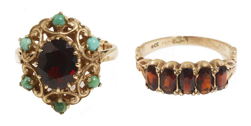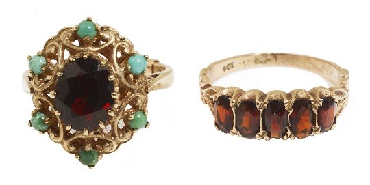 one a five stone garnet half hoop ring, the other a garnet and turquoise set oval cluster ring, both marked for 9ct gold (2)