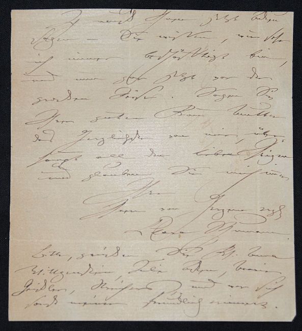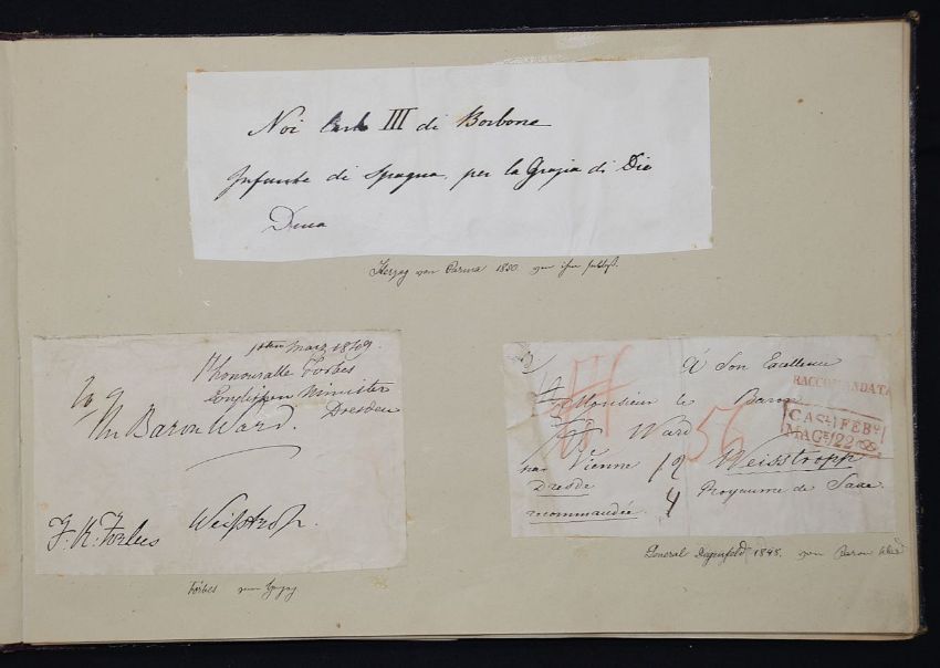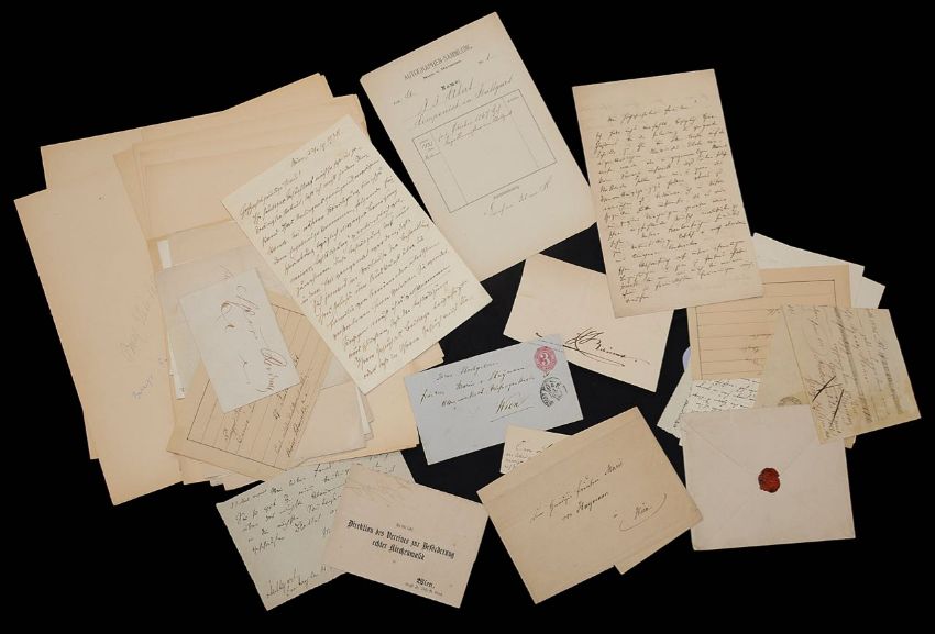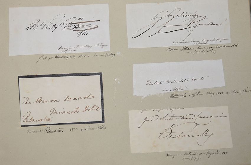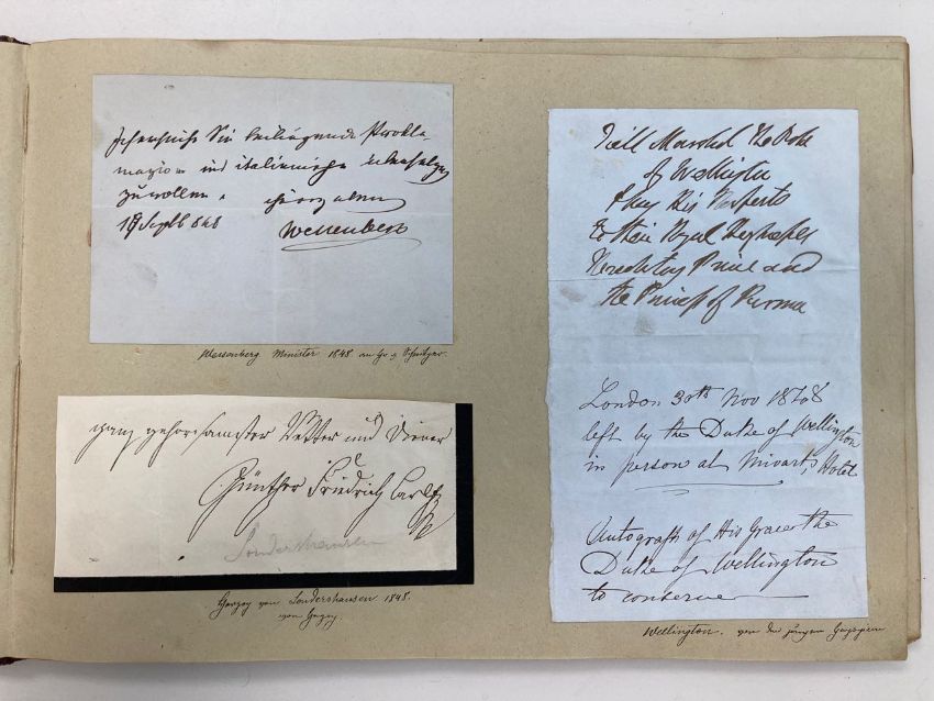 dating from 1841 until mid-1850s, and containing signatures from the Duke of Wellington, Viscount Palmerston, Francesco V, Duke of Modena, Leopold II, Grand Duke of Tuscany, Oscar II, King of Sweden, Charles-Louis, Duke of Lucca, Carlos Luis de Borb—n the Carlist pretender to the Spanish throne, Charles II, Duke of Parma, GŸnter Friedrich Karl II, Prince of Schwarzburg-Sondershausen, Frederick Francis II, Grand Duke of Mecklenburg-Schwerin, Count Josip Jela_i_, Charles-RenŽ de Bombelles, John Ponsonby, Zacharias Dase, pasted down in a volume bound in half morroco with paper boards with embossed floral motif, along with a folder of more autographed letters, clipped signatures and receipts relating to autograph collecting, including names such as Clara Schumann, (qty)