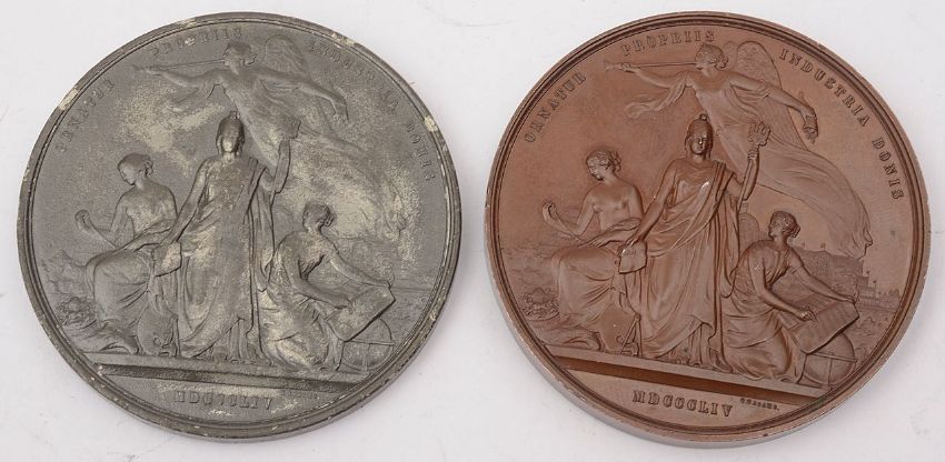 The opening of the Crystal Palace Sydenham, 1854 by GG Adams copper and and white metal medals both conjoined heads of Queen Victoria and Prince Albert left, he bare headed, she crowned. / Distant view of Crystal Palace. Britannia attended by Plenty and Learning. Fame with trumpet overhead, (2)diameter of both 63 mmCondition: first fine, second oxidized with surface marks and and wear. reverse rubbed on high points.edegs with light knocks and scratches.