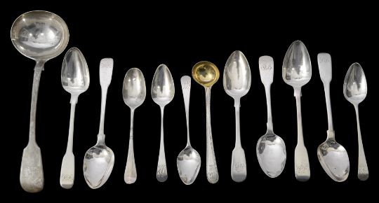 A William IV silver fiddle pattern sauce ladle and a selection of George III and later teaspoons etc.,