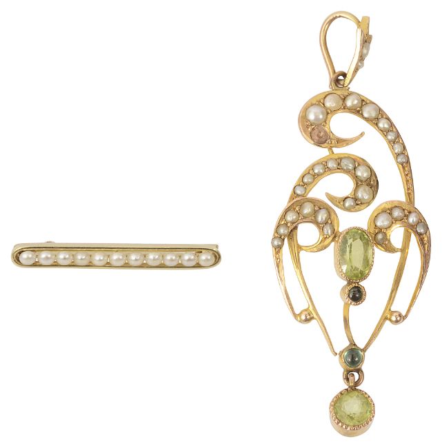An Edwardian peridot, half pearl and yellow gold pendant, of openwork scrolling design, set with two faceted peridot and two green stone cabochon collets to the half pearl (one deficient) scrolling border, the reverse stamped '9ct', 2.9g, length including loop 5.4cm; together with a seed pearl and 15ct yellow gold bar brooch, gilt tooled leather fitted case for The Goldsmiths and Silversmiths Company (2)the former weight 2.9g length including loop 5.4cm., bar brooch 2g., length 2.7cmCondition: Pendant: condition fair/reasonable (please note one half pearl deficient). Fairly lightweight gauge. Green cabochons probably tourmalines.Bar brooch: in very good condition, seemingly little used, possibly for a child e.g. a christening present. Stamped '15ct'. Case in good condition, interior very clean.