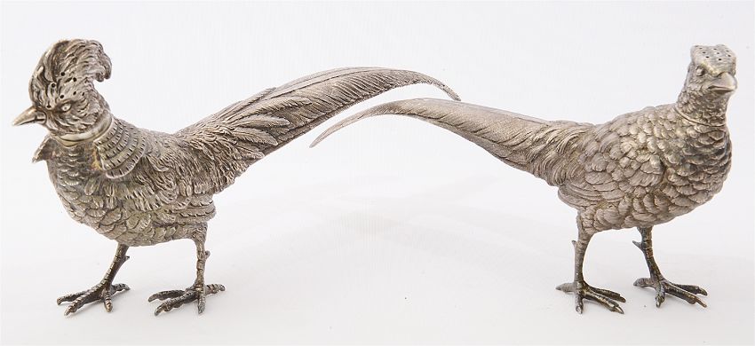 An Edwardian novelty silver pheasant pepper pot and another similar