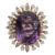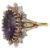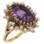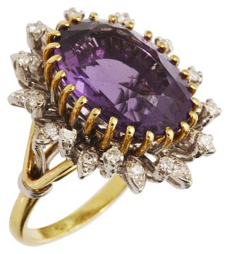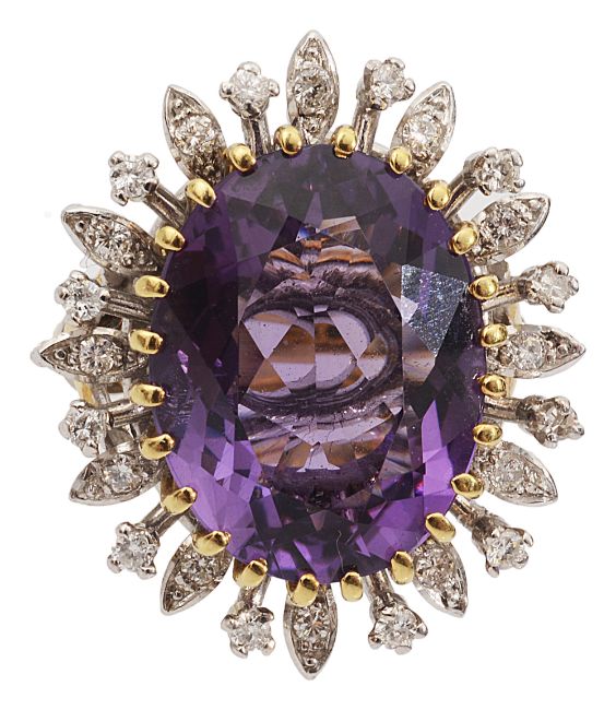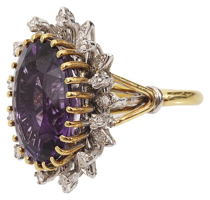An amethyst and diamond-set cluster ring, the central oval amethyst claw-set above the alternating foliate and circular motifs, each set with a brilliant-cut diamond, the trifurcated shoulders and plain shank stamped '[P]LAT'12.8g, size KCondition:Overall condition very good.Amethyst brighter and slightly stronger in colour than in catalogue illustration. Measures approximately 16.90mm by 12.50mm by 7.30mm.Diamonds bright with good/reasonable colour and clarity.