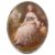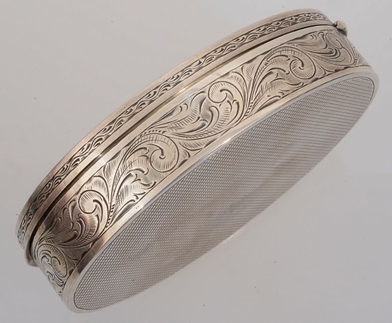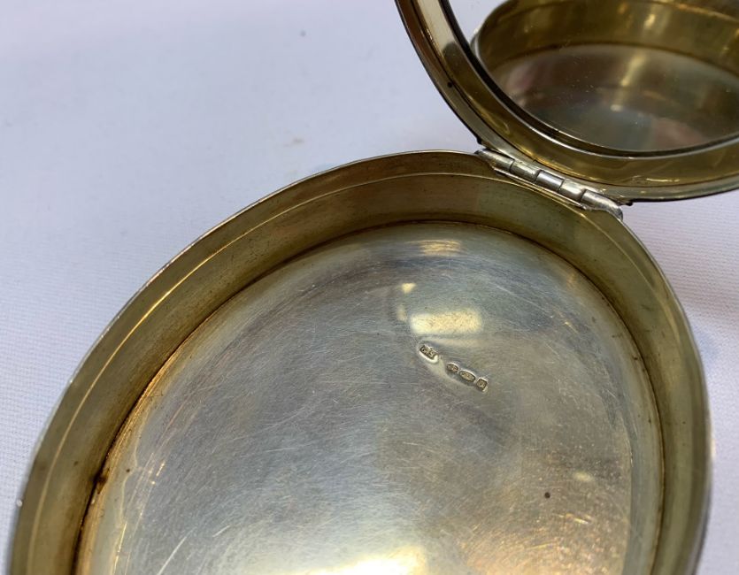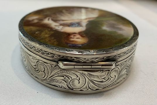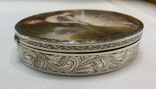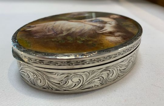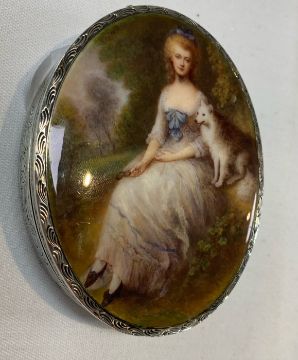 oval, the hinged lid finely painted after Gainsborough's portrait of Mrs Mary Robinson, the sides with foliate engraved decoration, the reverse engine turned, silver gilt mirrored interior
