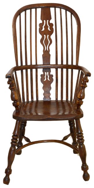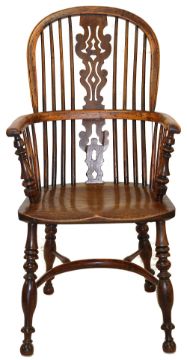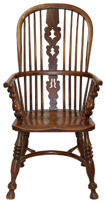 late 19th/early 20th century, each with hoop-back, double spindle supports, pierced splat, shaped saddle seats, turned legs joined by crinoline stretcher in various woods, including yew and elm (6),