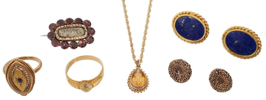 A collection of assorted items of jewellery: two yellow gold Victorian rings, one set with three old-cut diamonds, hallmarked 18ct, the other set with an oval mixed-cut sapphire; a pair of lapis lazuli and rope twist border earrings; a pair of circular textured earrings; a 19th century rectangular mourning brooch with plaited hair and garnet border; and a ovoid citrine pendant on a fancy link chain necklace, the bolt ring engraved '9ct'