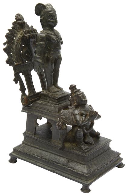 cast in three sections, the figure, probably Vishnu, standing on a platform base with bird supports and cast with kneeling figure Garyda in front, the mandorla cast with the heads of Naga