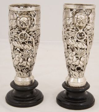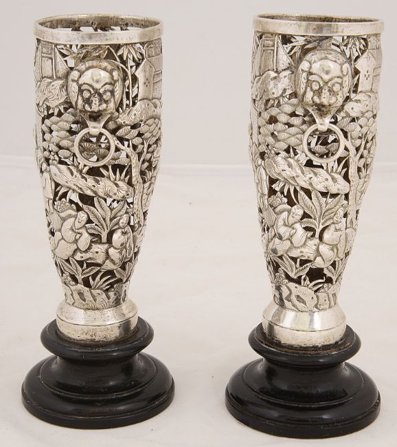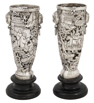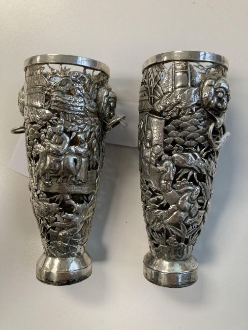 of tapering pierced form with twin mask ring handles, decorated with a landscape figure on horseback and other figures amongst bamboo, pine trees and buildings, ebonised circular plinth bases, (2)