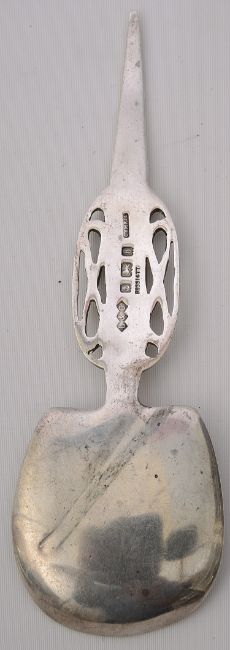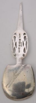 cast with pierced interlaced Celtic knot to stem, the shovel shaped bowl cast with blue and green enamelled Celtic knot and Anno. Coron.ERVII,