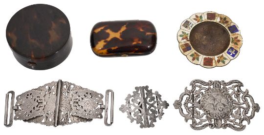 first with a silver-gilt hinge, London, 1919 by Charles Henry Dumenil, second stamped Sterling by Caron Brothers, and a Victorian pique inlaid moire silk lined purse together with a pierced silver buckle and two plated nurses buckles, (7)