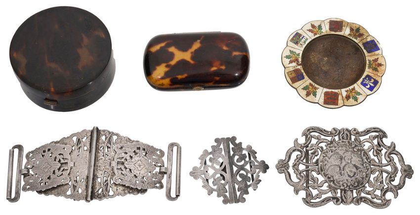 A George V circular tortoiseshell trinket pot, a Canadian silver and guilloche enamel souvenir ashtray and other items